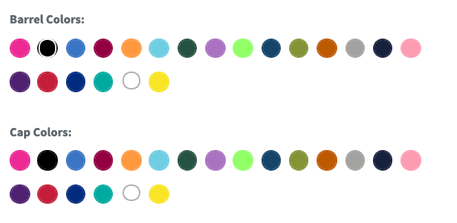 Available colors (you can have a different color for the barrel and cap, or the same color for both barrel and cap). Black, blue, burgundy, forest green, metallic dark blue, metallic green, metallic orange, metallic silver, navy, purple, red, royal blue, teal, white, yellow, berry (pink), creamsicle (orange), electric punch (neon blue), grape, julep (light green), pink